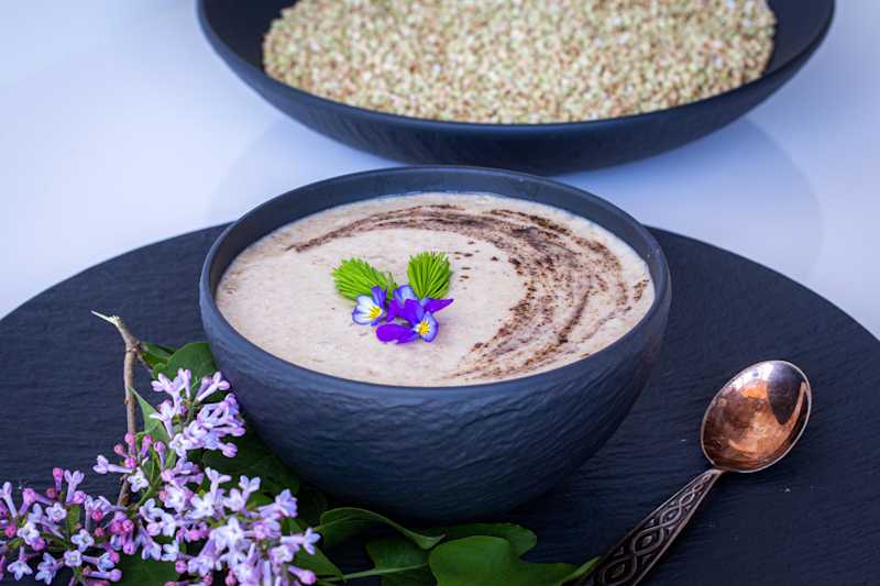 Here is how to make sprouted buckwheat. Soak your buckwheat overnight. This will activate the buckwheat kernels and they are ready to use however if you like to get out more nutrients, you can let your buckwheat sprout for 1-2 days until you see small roots growing. Now they are perfect and ready to be used in porridge! Blend all the ingredients together and serve in your favourite bowl! Enjoy!